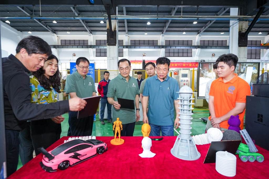 在智能制造实训基地,参加活动的党员参观了3D打印技术生产的水塔、滕王阁、人像扫描打印,了解了2025年中国国际大学生创新大赛项目《世界首创:异形内孔自适应磨抛倒圆去毛刺新技术与工具》,2025年广东省科技创新战略专项资金(大学生科技创新培育)项目《大规模储能用有机液流电池双极板轻量化设计和增材制造》,智能制造学院朱派龙教授科技论文转化为行业新型产品的介绍,观看了四足机器狗的“表演”。