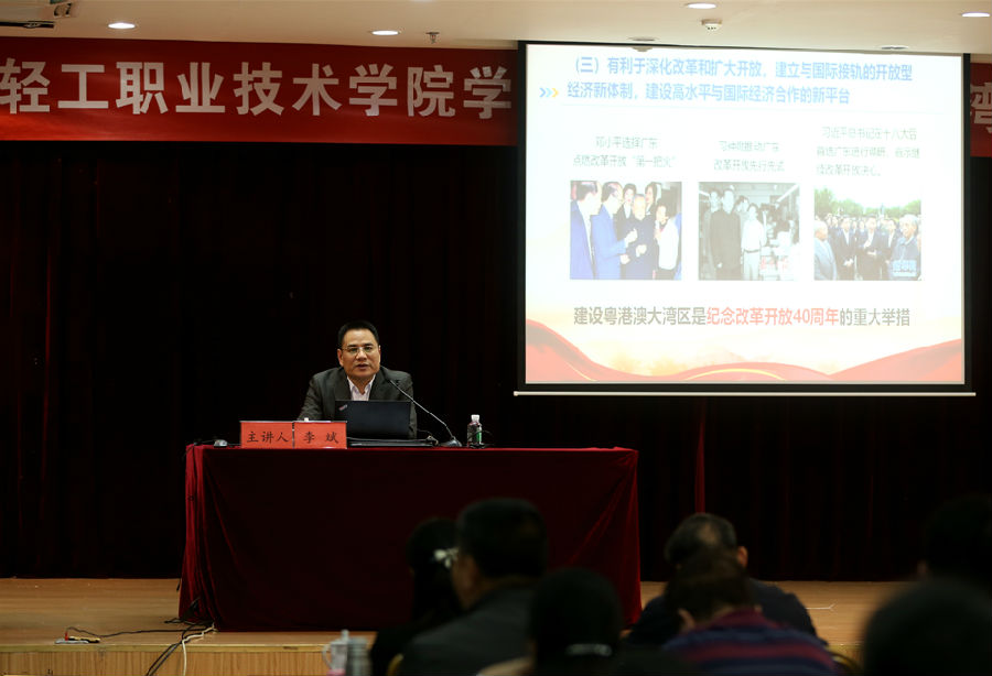 3月19日下午,学校在广州校区第二实训楼903和南海校区图书馆报告厅组织召开党委理论中心组学习(扩大)会议暨第八期“广轻大讲堂”活动,邀请省委宣传部讲师团团长李斌宣讲《粤港澳大湾区发展规划纲要》。校领导、副科级及以上干部、党支部书记、学生党员约500人分别在广州和南海两校区聆听了宣讲报告。党委书记杜安国主持宣讲会。
