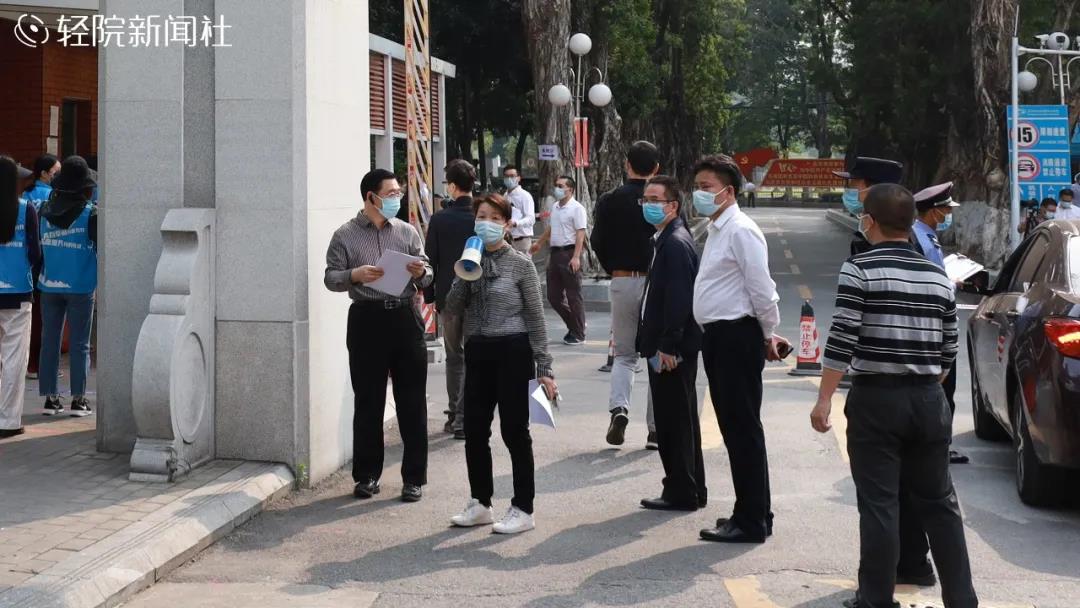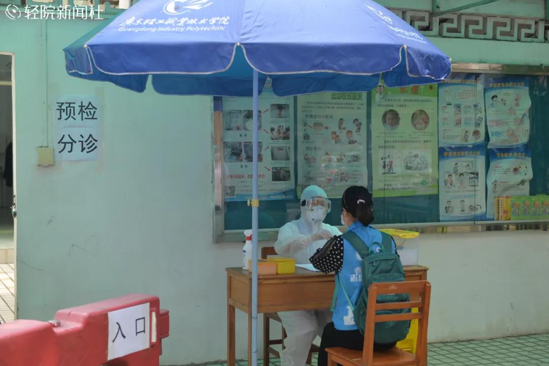 “同学”们戴着口罩,按照地上的提示线排好队,依次走过人脸识别门禁、测温区、登记区。工作人员在测温区用测温仪对学生逐个进行体温检测,检查穗康码是否为绿码,并对学生行李等物品进行消毒。体温正常、无其他症状者,方可进入校园。