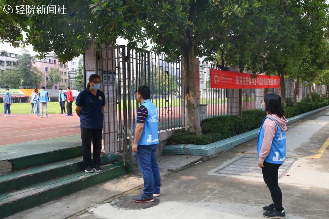 返校后,同学们在运动时也不要忘记防疫,运动场入口处设置专员检查进出人员是否佩戴口罩。