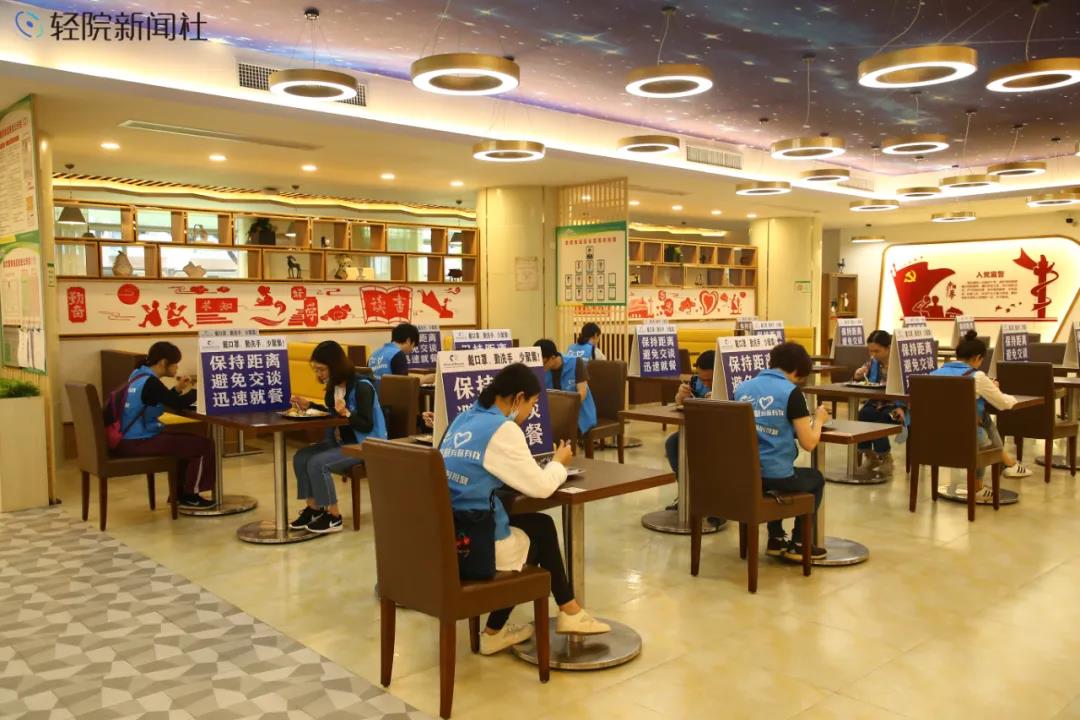 出入口也设置了洗手池,配置抑菌洗手液或含乙醇免洗洗手液,引导“同学”和教职员工就餐前后都要洗手消毒。大家戴好口罩,按照“间隔一米”地贴的指示,在特定区域依次排队取餐。餐桌上摆着“保持距离、避免交谈、迅速就餐”的餐位标识,就餐的师生按标签就座、错位就餐,不交流、少说话。用餐时段结束后,食堂对全部餐具和就餐环境进行消毒。