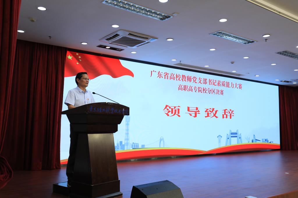 杜安国在致辞中对出席活动的嘉宾及选手致以热烈的欢迎并表示,本次大赛由学校承办,既是省教育工委对学校发展的充分肯定,也是对学校党建工作的鞭策。杜安国指出,本次大赛既是展示广东教师党支部书记素质能力的舞台,也是促进“比学赶超”实现素质能力提升的创新举措。期待各位选手以此次大赛为契机,以高度的责任感和使命感,不断加强自身能力建设,为培养德智体美劳全面发展的社会主义建设者和接班人发挥更大的职教作用。