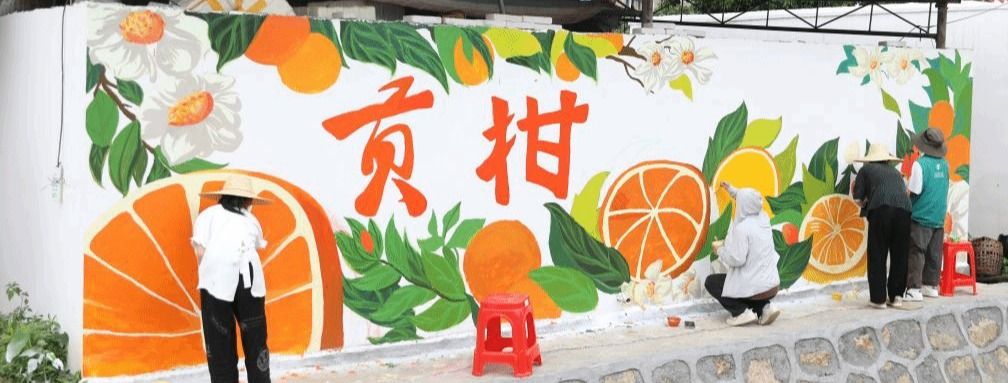 德庆县马圩镇入口河道两旁,学校青年大学生“百千万工程”突击队描绘贡柑产业图谱
