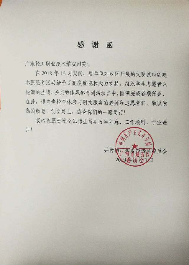 近日,共青团广州市越秀区委员会给乐动注册写来感谢信,感谢乐动注册志愿者对共青团区委工作的大力支持。