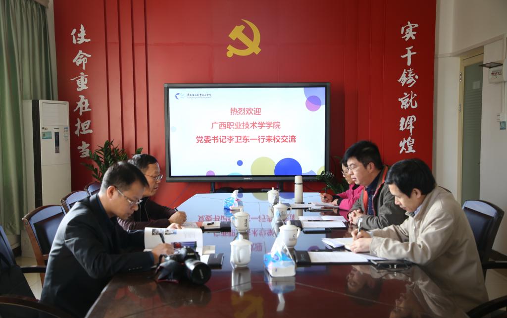 12月20日下午,广西职业技术学院党委书记李卫东带领该校党委办公室(学院办公室)副主任周治一行人到访乐动注册。乐动注册党委副书记李铭辉热情接待了来访客人。
