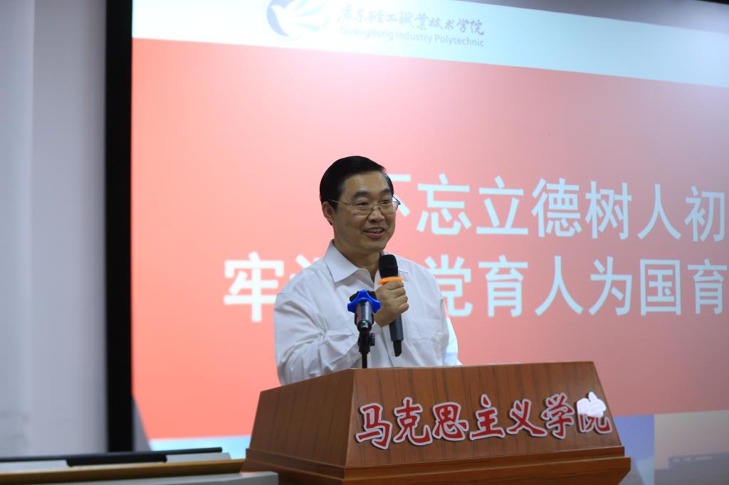 首先进行了新教师入职宣誓。与会人员全体起立,唱中华人民共和国国歌。68名新入职教师面对国旗,右手握拳举过头顶庄严宣誓:“我志愿成为一名人民教师,忠诚党的教育事业,遵守教育法律法规,履行教书育人职责,引领学生健康成长,做到有理想信念、有道德情操、有扎实学识、有仁爱之心,为教育发展、国家繁荣和民族振兴努力奋斗!”宣誓仪式由卢坤建监誓,广东省珠江学者特聘教授、广东省妇女第十三次代表大会正式代表,广东省包印防伪材料与设计工程技术开发中心主任向华教授领誓。