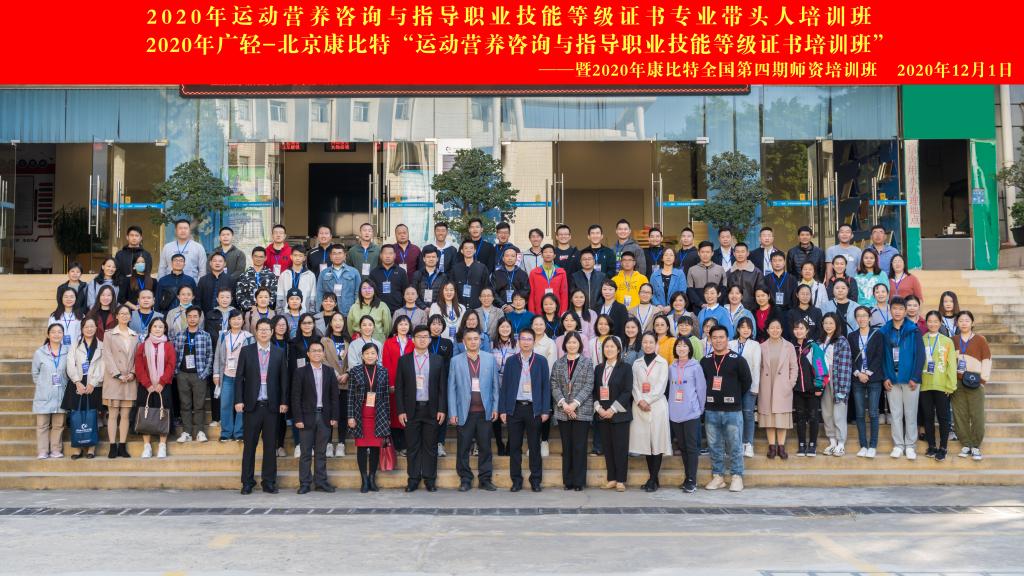 2020年12月1日-12月6日,运动营养师咨询与指导职业技能等级证书专业带头人培训班,2020年广轻-北京康比特“运动营养咨询与指导职业技能等级证书培训班”暨2020年康比特全国第四期师资培训班在乐动注册举行,学校副校长邓毛程出席开班仪式并讲话。来自17个省份32所学校总计120名学员参加。